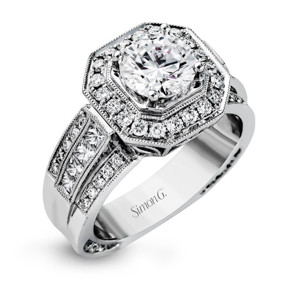Featuring an impressive modern design, this white gold ring is accented by .60 ctw round cut white diamonds and .40 ctw princess cut diamonds. Does not include center stone. Can accommodate a variety of center diamond sizes, starting at 0.50 carats. Can accommodate different diamond cuts, available by special order.